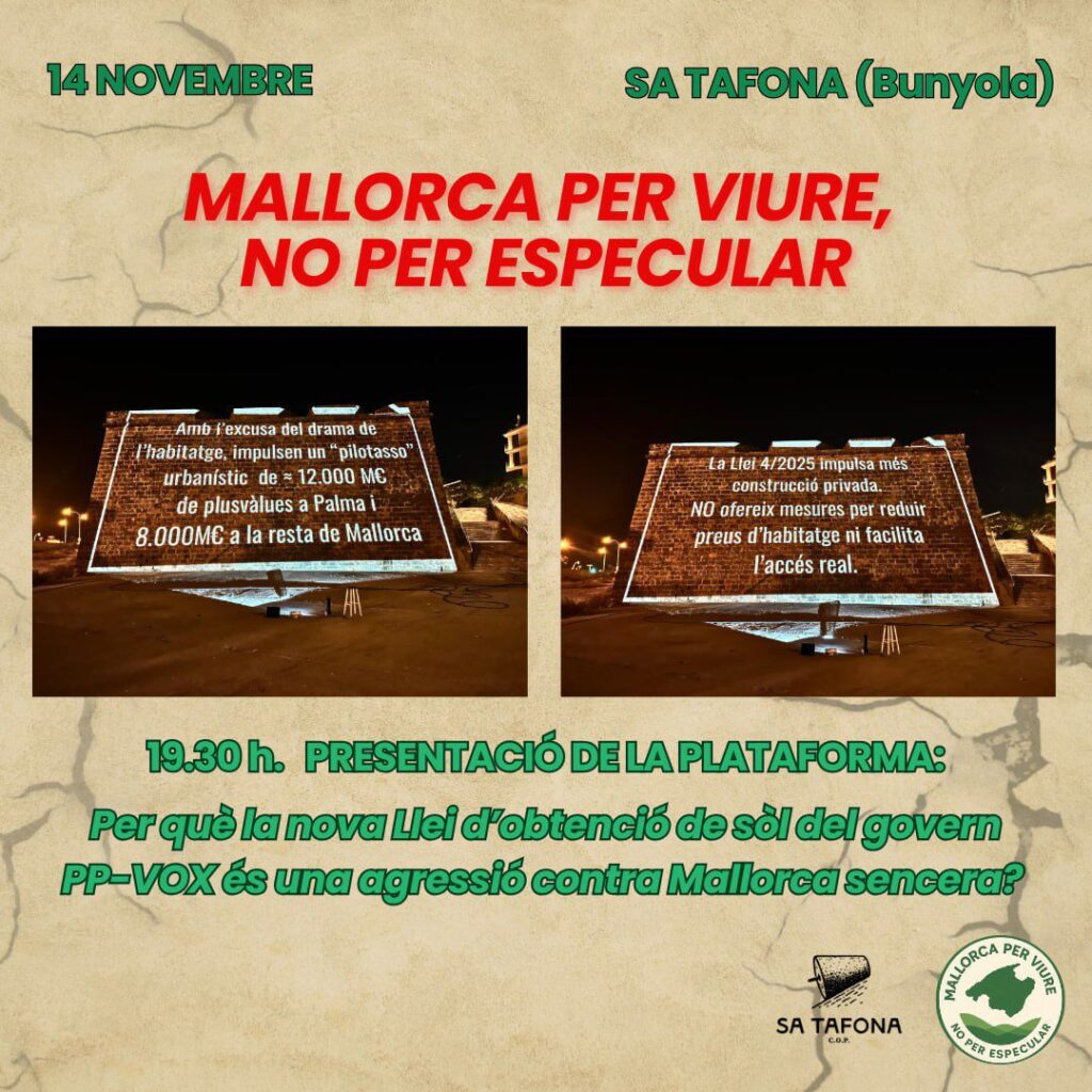 Divendres 14 de novembre, 19:30h. Presentació de la plataforma “Mallorca per viure, no per especular”.