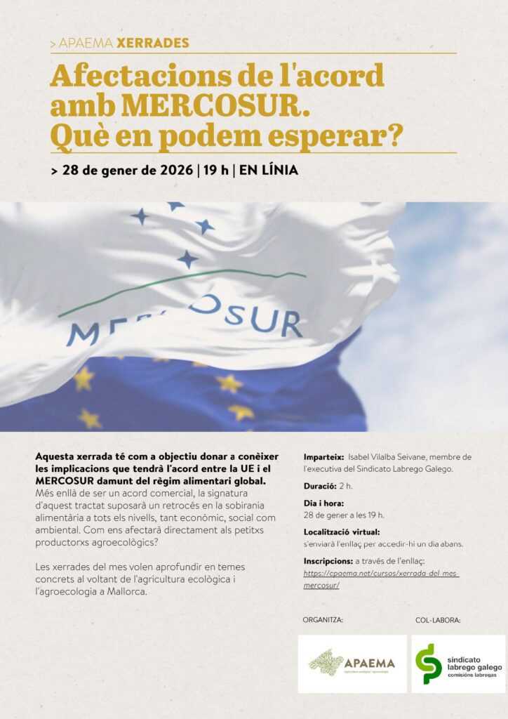 Què en podem esperar com a pagesia i com a societat? En aquesta xerrada una veu experta explicarà les implicacions reals de l’acord UE–MERCOSUR sobre el règim alimentari global i l’impacte directe que pot tenir sobre els petits productors agroecològics, l’economia agrària i la sobirania alimentària.