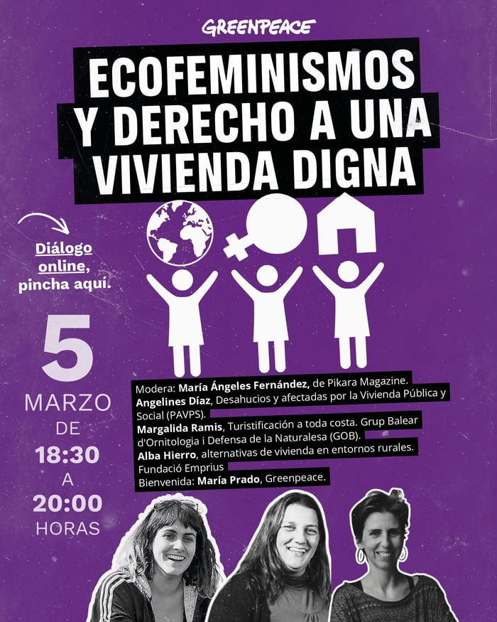 Que què tenen a veure els ecofeminismes, o l’ecologisme, amb el dret a l’habitatge? Els ecofeminismes proposen un canvi de model social i econòmic que posi al centre el sosteniment de la vida. Això implica protegir la natura —de la qual depenem— i garantir els drets bàsics de totes les persones, com el dret a l’habitatge. El mateix sistema que destrueix el clima és també el que converteix l’habitatge en un bé especulatiu en lloc d’un dret.
