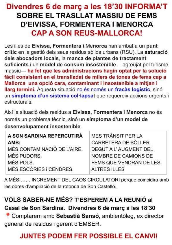 Contaminació de l’aire, pudors, pols, cendres… el trasllat massiu de fems cap a Mallorca pot tenir un impacte ambiental, social i per la salut molt greu. Informar-nos i organitzar-nos és clau. Divendres 6 d març a les 18.30.