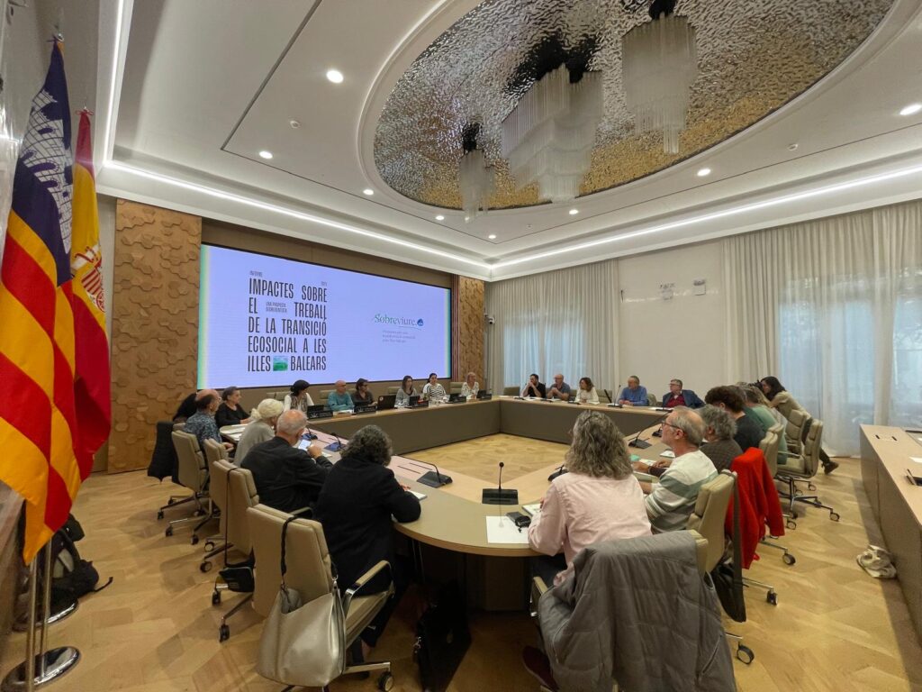 Avui una cinquantena de persones representants de diferents col·lectius i entitats socials, sindicats, partits polítics i mitjans de comunicació, ens han acompanyat a la presentació de l’informe “Impactes sobre el Treball de la Transformació Ecosocial a les Illes Balears. Una proposta decreixentista”, omplint de gom a gom la Sala d’Actes del Parlament.