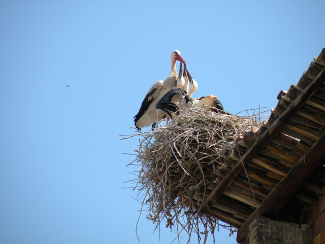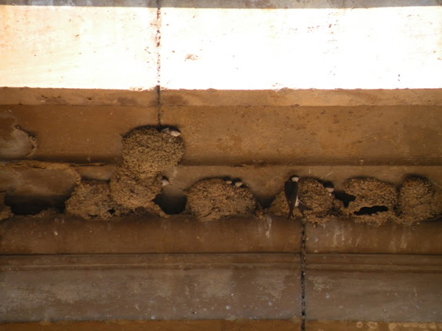 Va ser també en el viatge a Lleida, concretament a la mateixa ciutat i a un jardí al costat del Segre que vaig observar aquest niu de falzies al forat d'un plataner, la gent m'observava, amb la càmera a punt, sense saber ben bé què feia tant de temps esperant. A la fi vaig poder fer la foto que veis i és que les falzies volen molt aviat. També és increïble per a mi observar les cigonyes tan tranquil·les sobre els edificis antics, també sobre grues. El xiscle de les falzies és una música per aquesta ciutat. Les oronelles i els cabots ho acaben d'adobar.