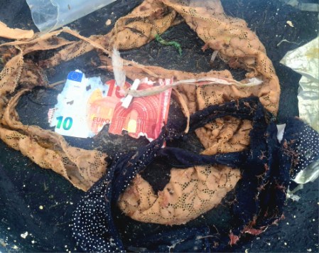 Mentrestant, sa mare fingeix sorpresa, i recull sa tovallola de davall des para-sol... dissimulant sa billetera amb vint euros menys,